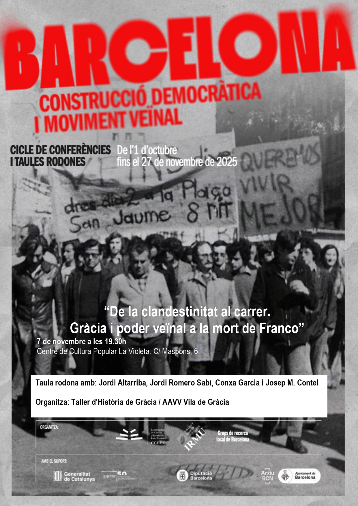 El pròxim dijous 7 de novembre, a les 19:30 hores, us convidem a participar en el cicle de conferències i taules rodones “Barcelona: Construcció democràtica i moviment veïnal”